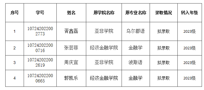根据《西安外国语大学本科学生转专业管理办法》及教务处2023年转专业安排,经教务处资质审核、在线体育博彩 组织面试考核、在线体育博彩 专家评审、在线体育博彩 党政联席会议讨论通过,现拟录取以下同学进入日语专业2023级学习,名单公示如下: